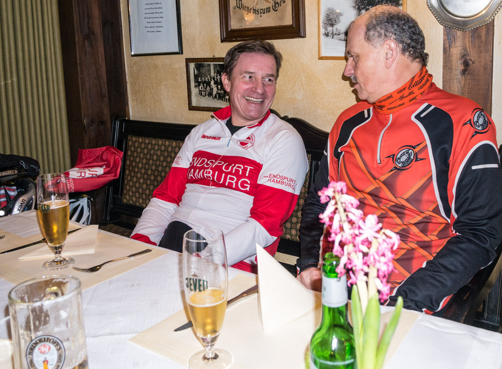 Es waren nicht alle gekommen, aber insgesamt sieben Radfahrer und Michael wollte später zum Essen dazu stoßen, das reichte um nicht noch beim Landhaus Voigt anzurufen. Bestellter Tisch für zehn und acht kommen, das geht in Ordnung. Wir müssen uns allerdings wieder um die Frauenquote Sorgen machen. Und auch mit dem gemeinsamen Essen ergeben sich ja zunehmend Schwierigkeiten einen gemeinsamen Nenner zu finden. Kein Schwein, kein Fleisch, kein Tier, vegetarisch oder vegan. Stint satt war angesagt und wir sind satt geworden, aber es gab Malzbierprobleme.